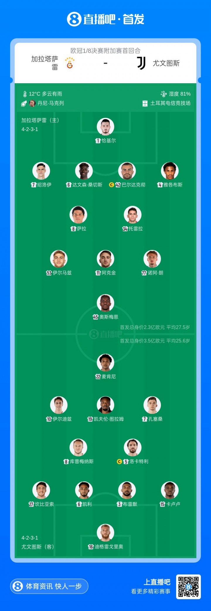 2月18日讯 欧冠1/8决赛附加赛首回合,尤文图斯客场对阵加拉塔萨雷,赛前首发名单公布。